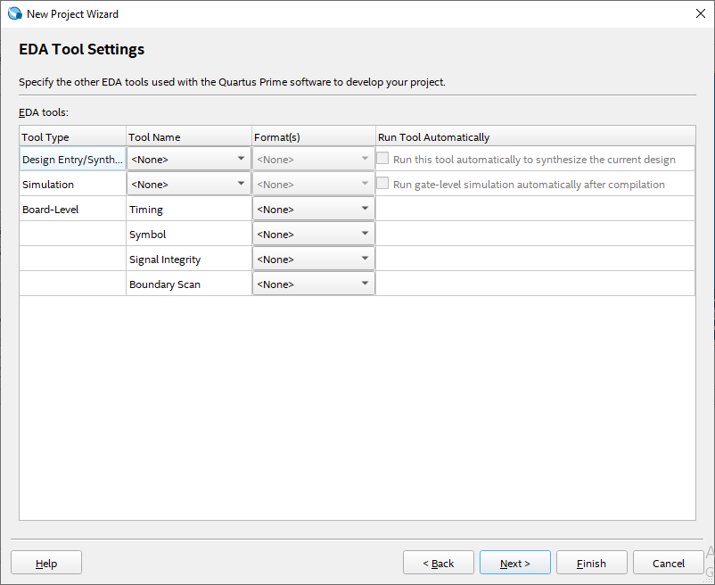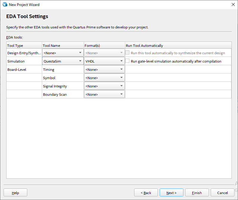 - We won’t change default tool settings, so, press Next. Or, we can select the desired simulation tool, choose