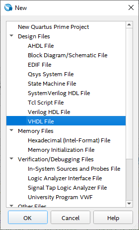 Newdialog window, underDesign Files, selectVHDL Fileand pressOK.
