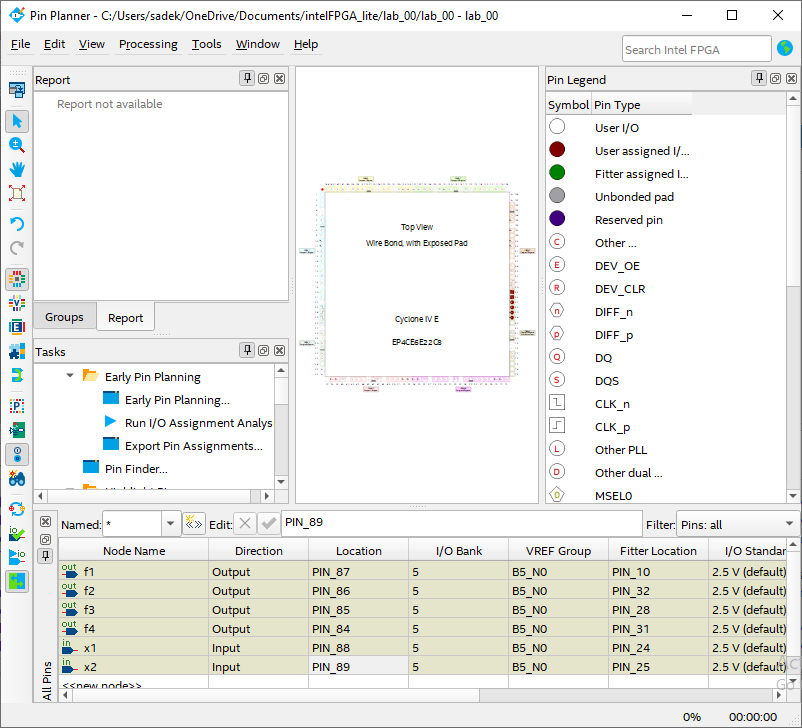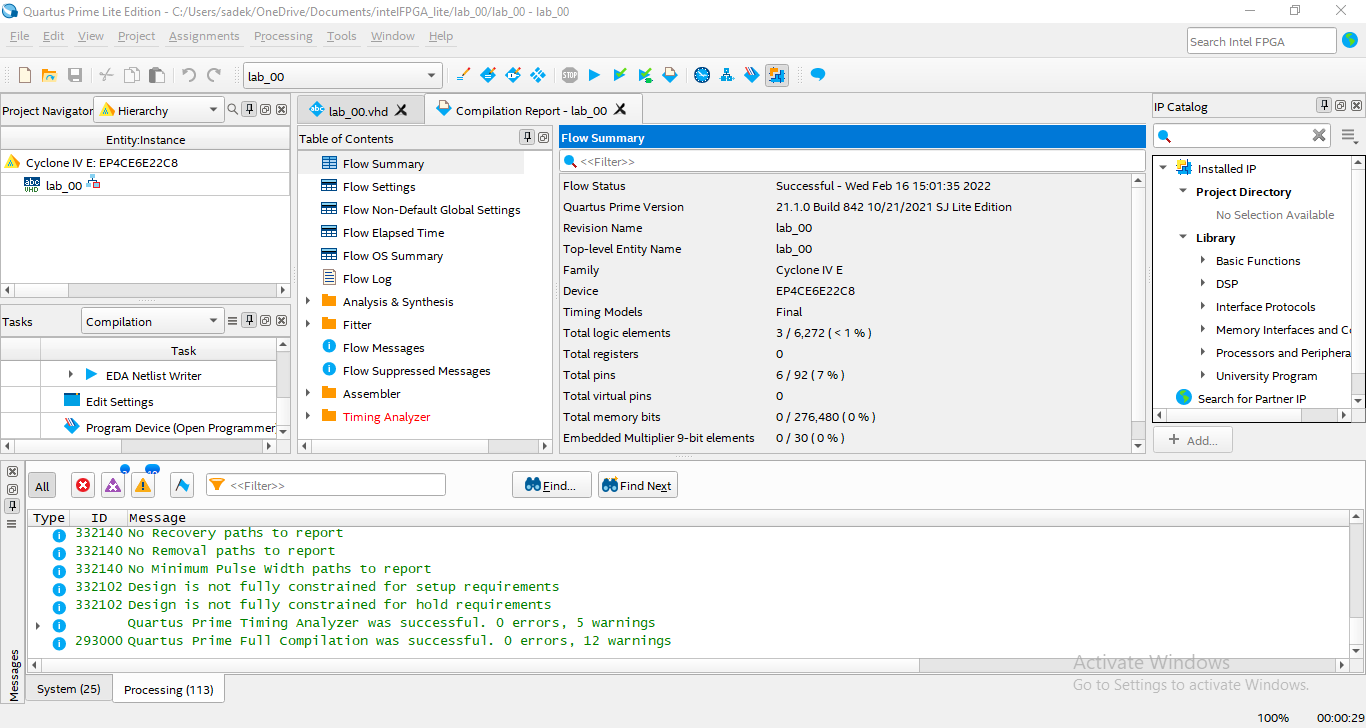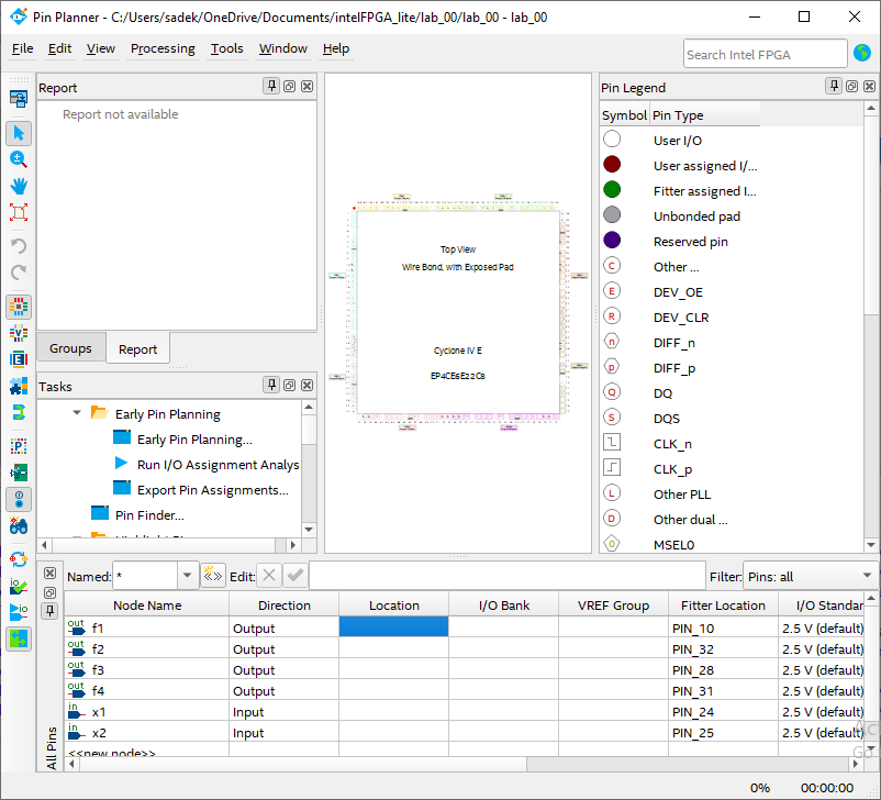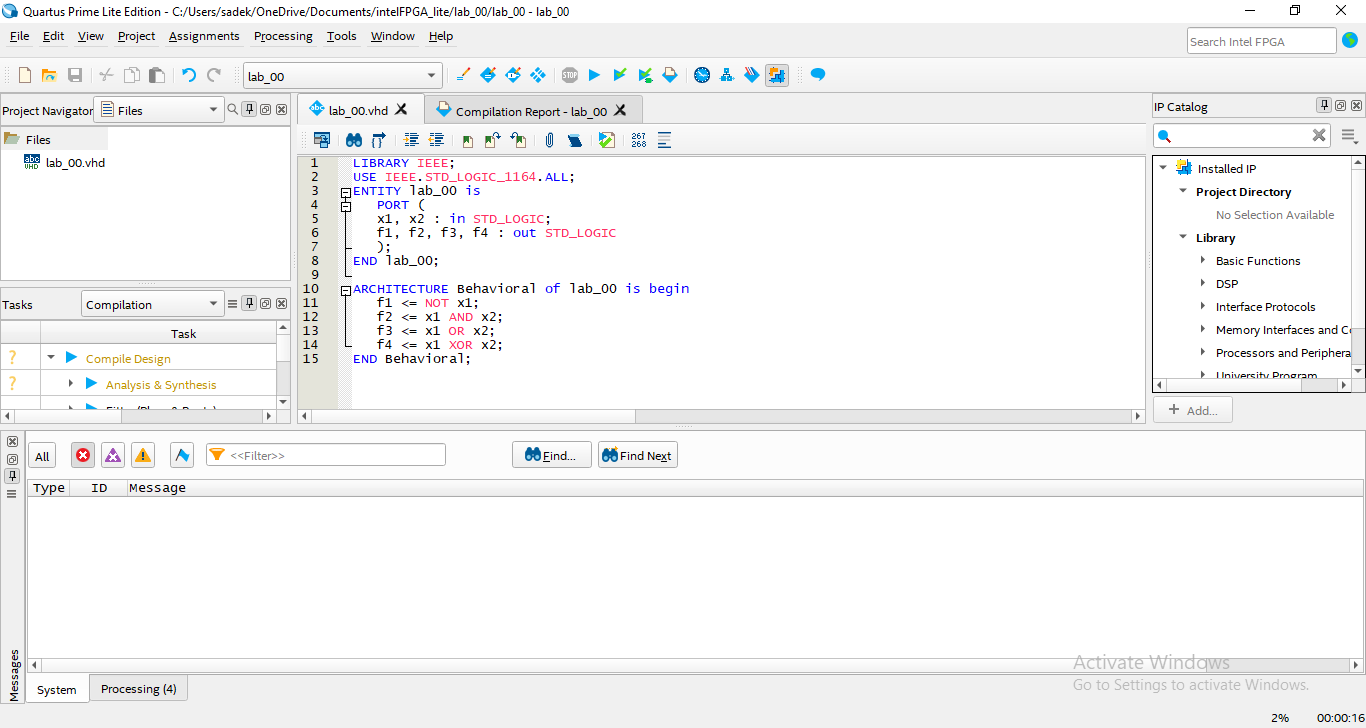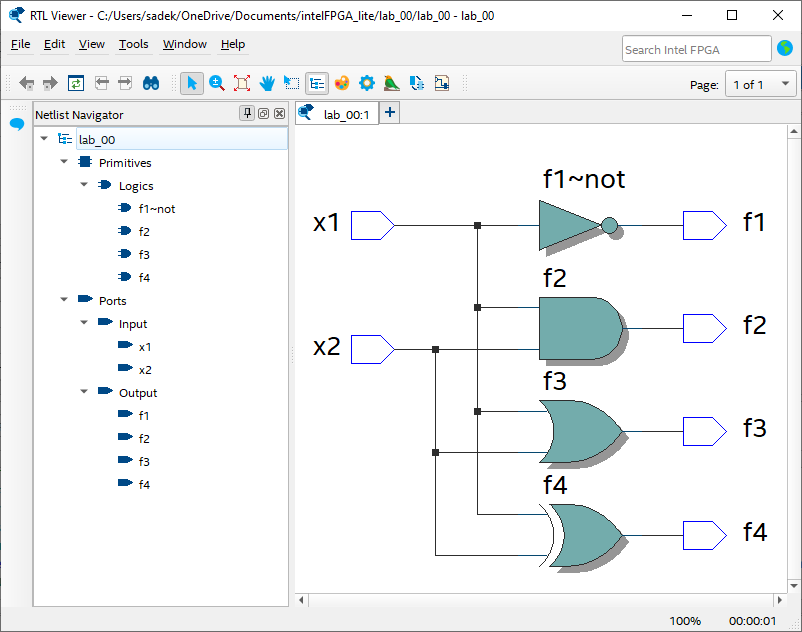LIBRARY IEEE; USE IEEE.STD_LOGIC_1164.ALL; ENTITY lab_00 is PORT ( x1, x2 : in STD_LOGIC; f1, f2, f3, f4 : out STD_LOGIC ); END lab_00; ARCHITECTURE Behavioral of lab_00 is begin f1 <= NOT x1; f2 <= x1 AND x2; f3 <= x1 OR x2; f4 <= x1 XOR x2; END Behavioral;💡Important: In VHDL, theEntityname must be the same as the project name, otherwise, you have to add the new entity as the top-level entity of the project [Tutorial to add the new entity as the top-level: Intel Quartus Prime Tutorial Part 6 | Error Top-level design entity "name" is undefined - YouTube]