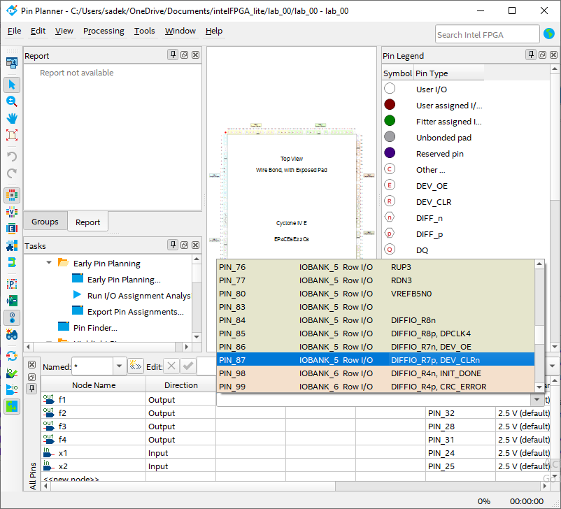 - Double-click in the Location column in front of each input/output pin, a drop-down list will appear.