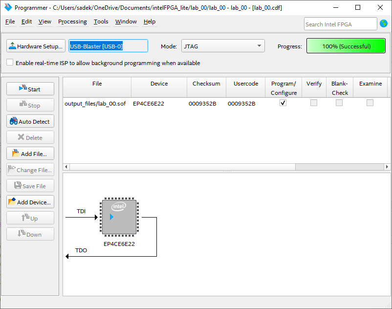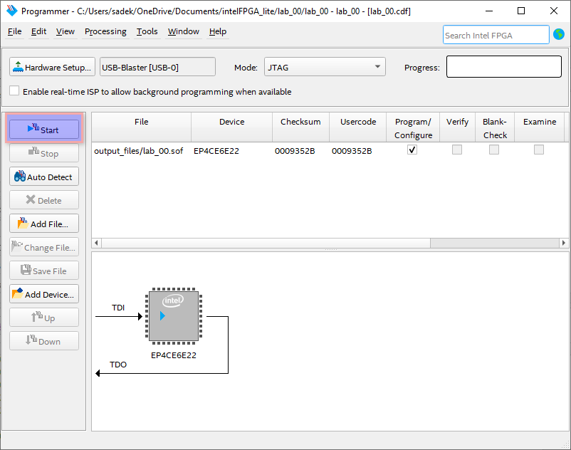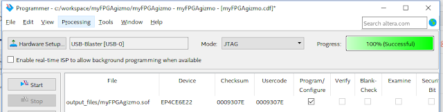 - Finally, we're ready to send the FPGA code to our device. To Program the FPGA kit: Click