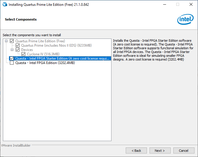 QuartusLiteSetup,QuartusProgrammerSetupandQuesta - Intel FPGA Starter Edition, select the required installations as in the following image.
