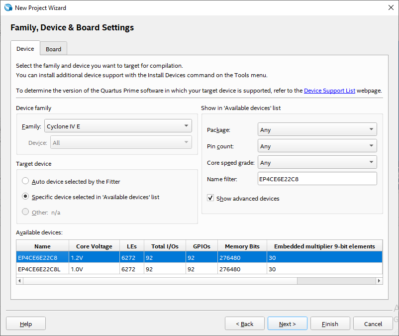 EP4CE6E22C8Nthe fourth generation. So, select the right chip and press Next.
